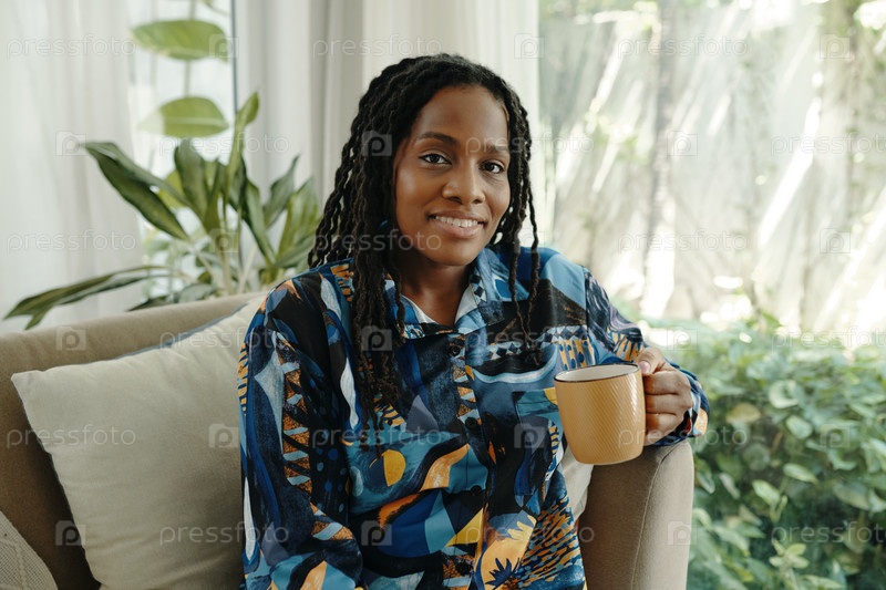 Сидящая женщина держит кружку в расслабляющей гостиной