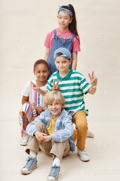 Мультиэтническая группа из четырех улыбающихся детей, показывающих знак V, позируют вместе в студии