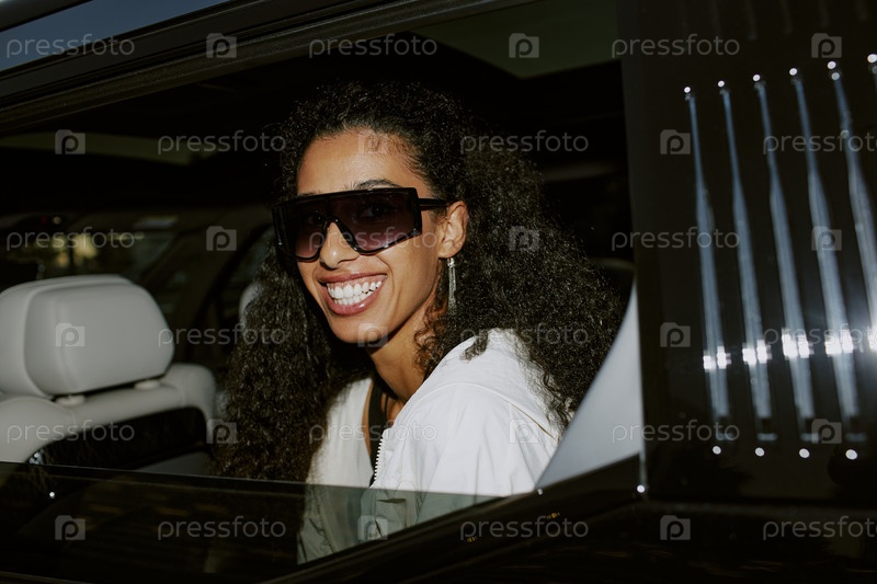 Портрет улыбающейся знаменитости в солнцезащитных очках, сидящей в машине