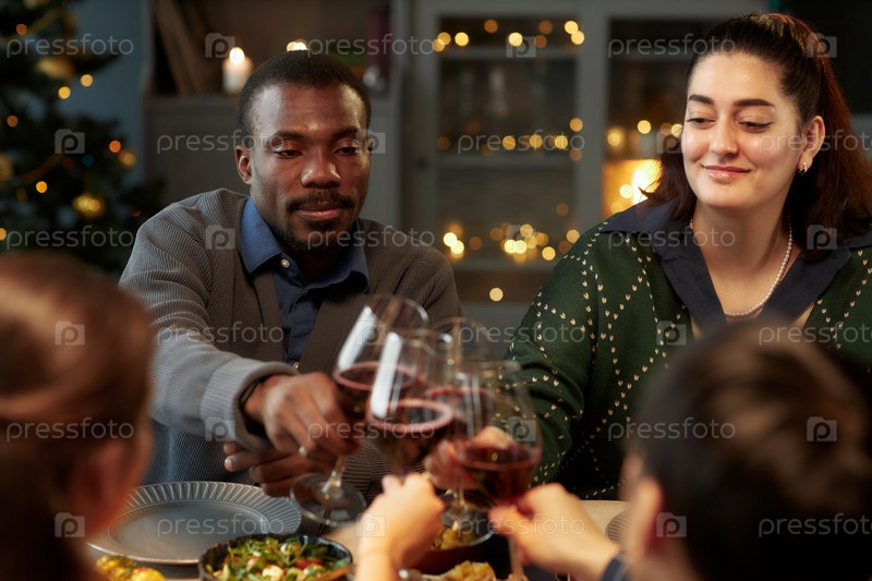 Женщина и чернокожий мужчина стучат стаканами вина, празднуя Рождество с друзьями дома