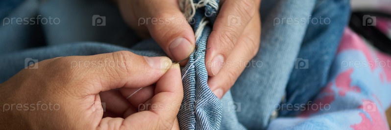 Клейкая игла с нитью в джинсе