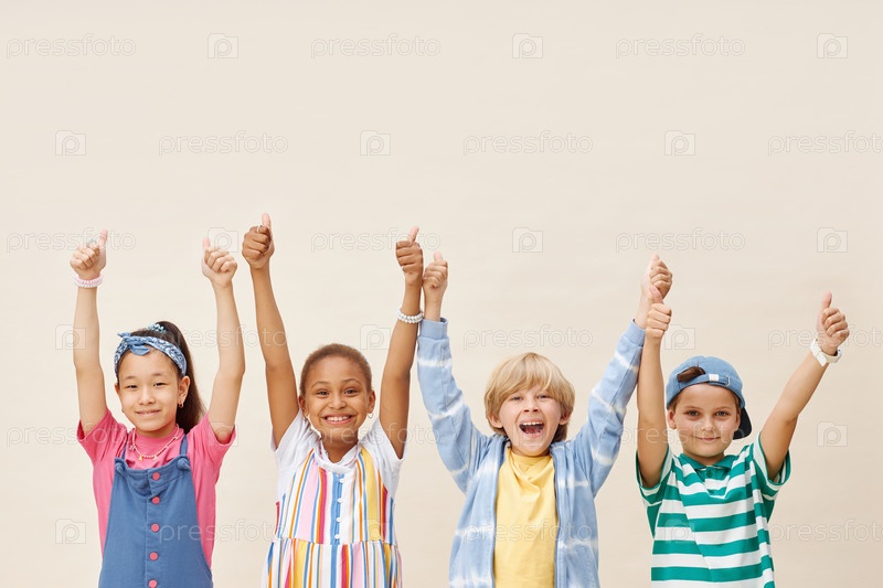 Линия из четырех улыбающихся детей, поднимающих руки и показывающих большие пальцы на нейтральном фоне в студии