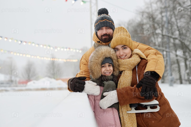 Счастливая семья с дочерью, стоящей на конькобежном катке