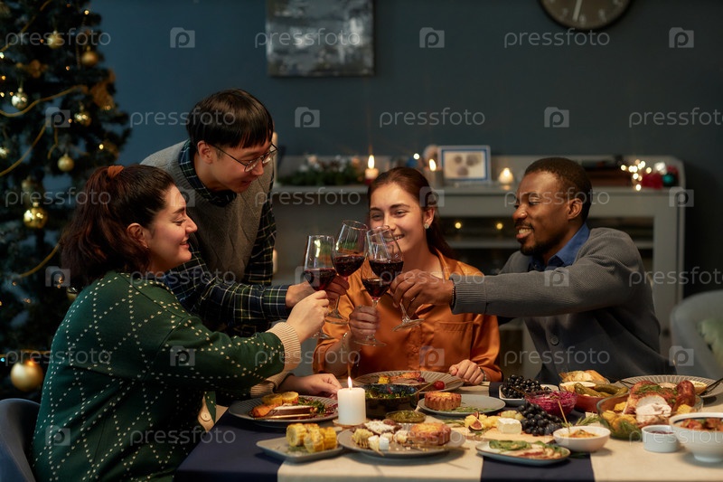 Мультиэтническая группа друзей, стучащих очки, сидящие за обеденным столом в канун Рождества дома