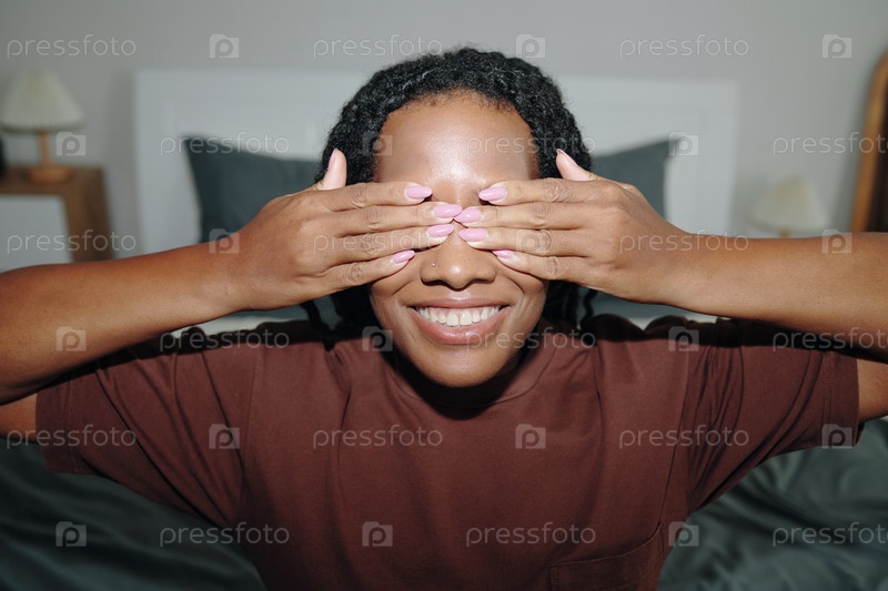 Улыбающаяся женщина закрывает глаза руками в помещении