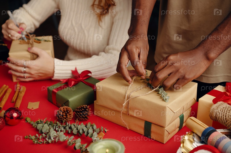 Упаковывание праздничных подарков с сосновыми шишками и лентами