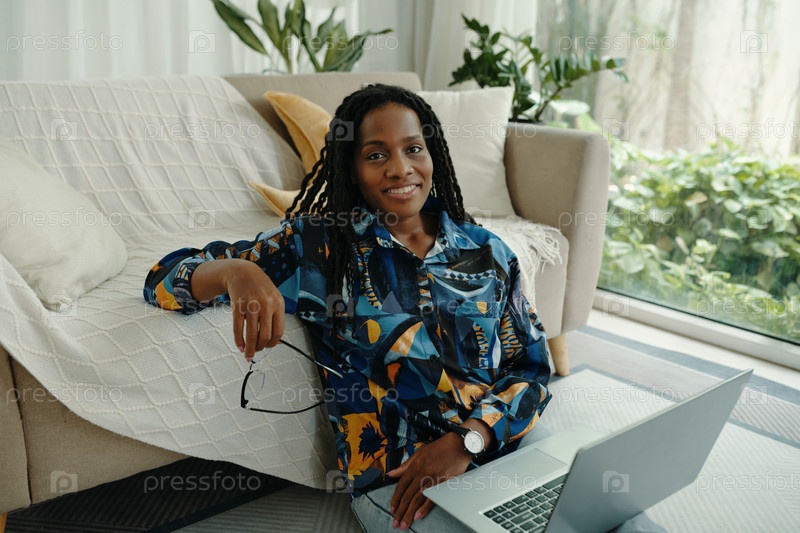 Расслабляющаяся и улыбающаяся женщина в домашнем офисе