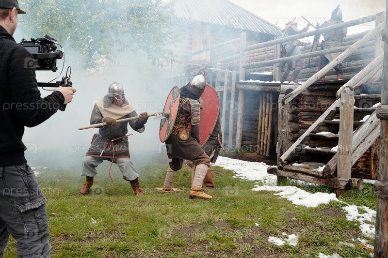 Съемка средневековой битвы с актерами в доспехах