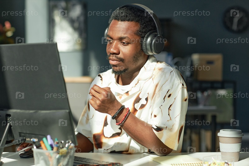Чернокожий человек использует компьютер в наушниках в офисе под солнцем