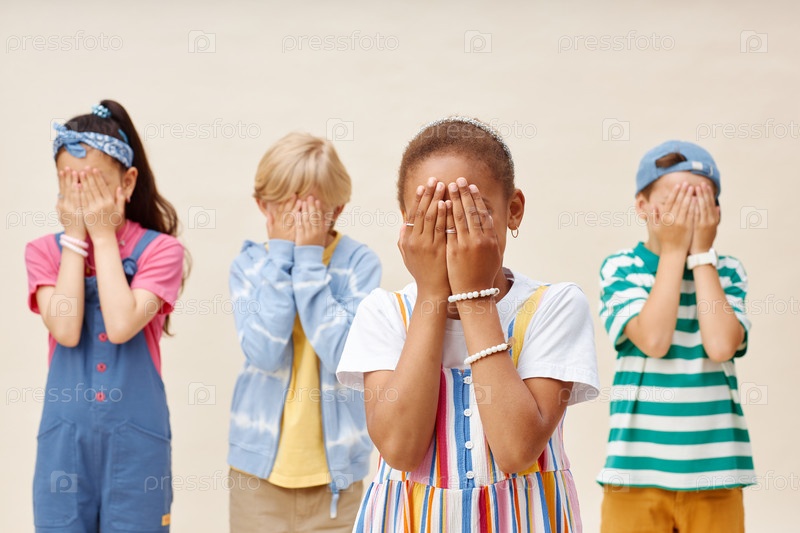 Страшные дети в возрасте до четырнадцати лет, закрывающие глаза руками в студии