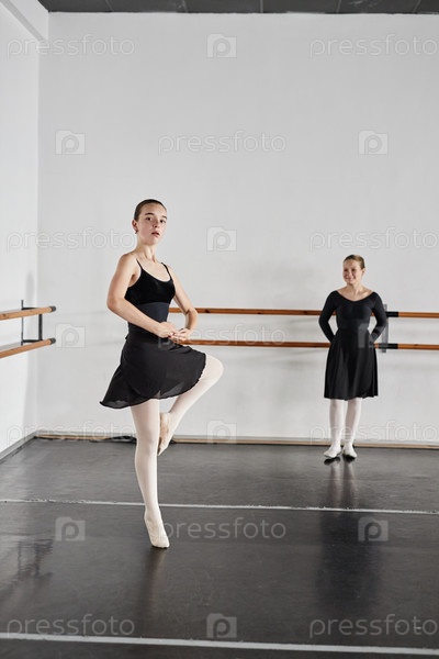 Молодая балерина в черном платье практикует пируэты во время танцевального класса Indoors