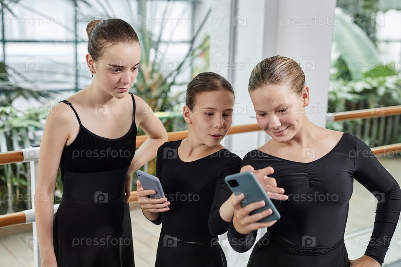 Три балетные танцовщицы веселятся, используя телефоны после занятий спортом в помещении