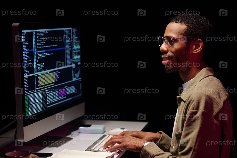 Фокусированный программист анализирует код на экране компьютера