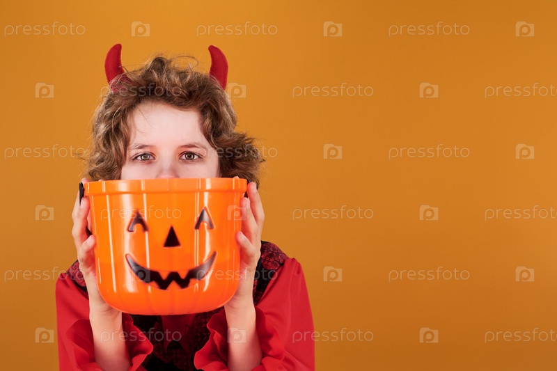 Мальчик заглядывает из-за оранжевого ведра