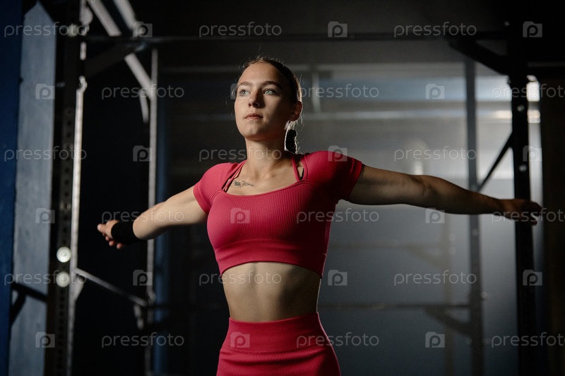 Спортсменка в розовом цвете Top Crop Stretching Arms Отопление перед тренировкой в спортзале