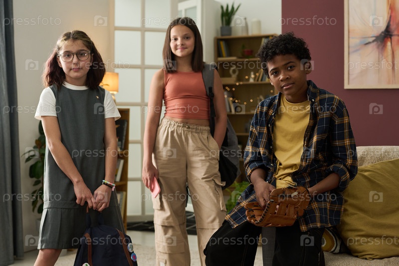 Группа детей, держащих рюкзаки, стоящие в гостиной