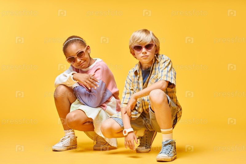 Два веселых ребенка в солнцезащитных очках сидят на приседаниях, делая классные позы в желтой студии