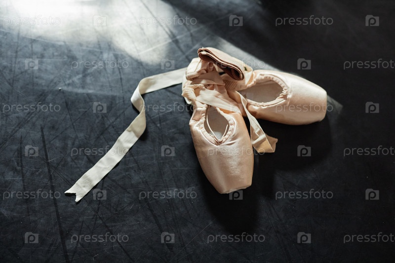 Новые балетные туфли с лентами на солнечном свете, отдыхающие на полу в танцевальной студии