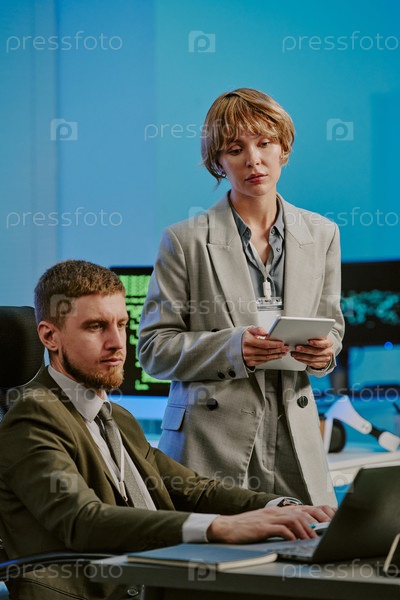 Мужчина и женщина работают вместе в офисе по безопасности данных