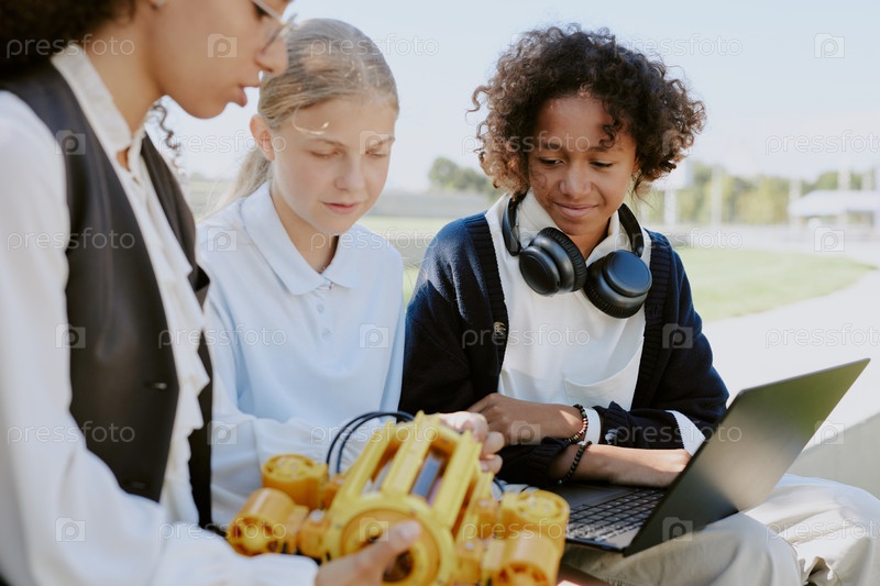 Бирациальные студенты веселятся во время урока робототехники