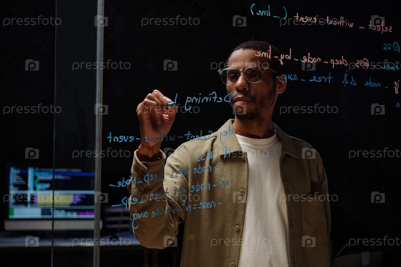 Бизнесмен пишет на стеклянной стене в современном офисе