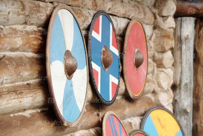 Выставка щитов викингов на деревянной стене
