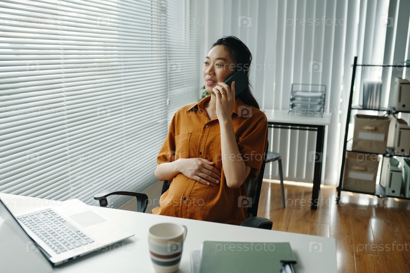 Улыбающаяся беременная женщина разговаривает по телефону в современном офисе