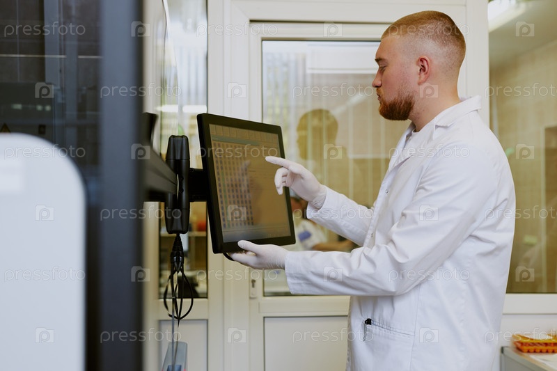 Исследователь анализирует данные на экране компьютера в лаборатории
