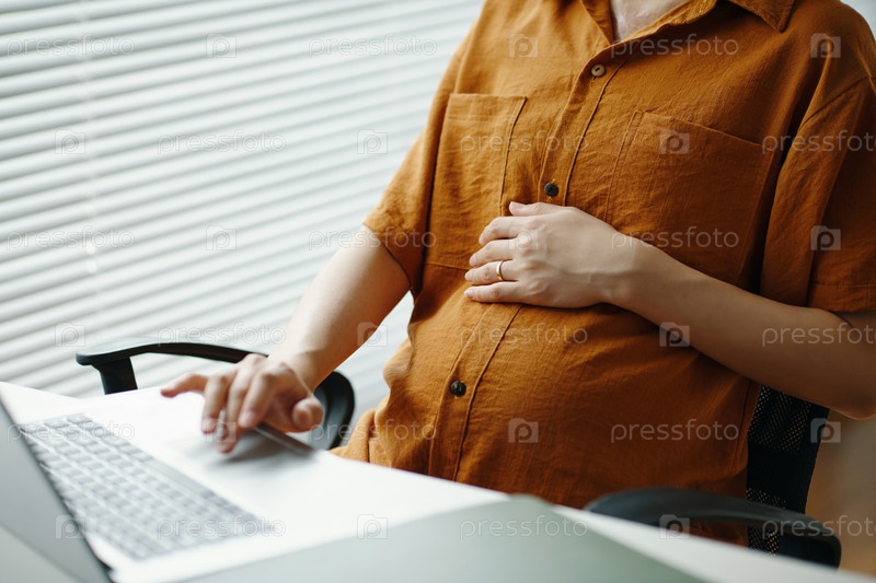 Беременная женщина работает на офисном столе с ноутбуком