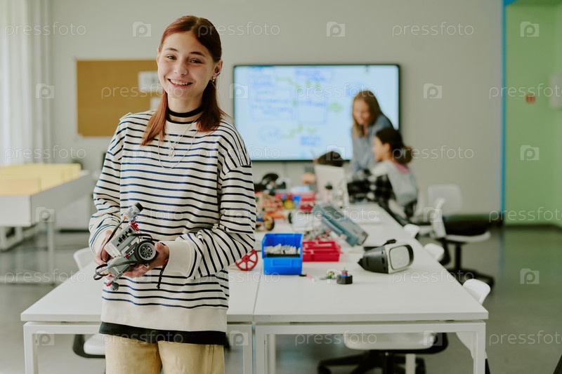 Девушка держит робота для фотографии Счастливая