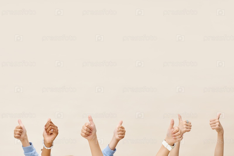 Руки детей поднимают большие пальцы, показывая одобрение на нейтральном фоне в студии