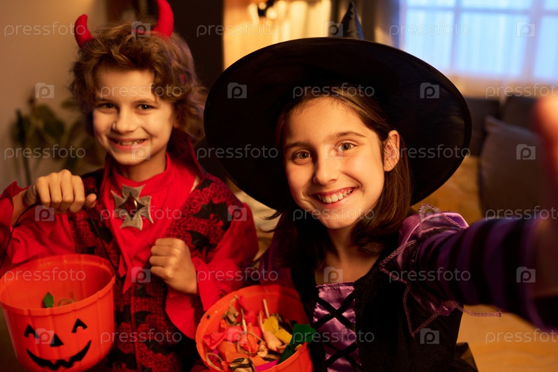 Милые дети улыбаются, делая селфи