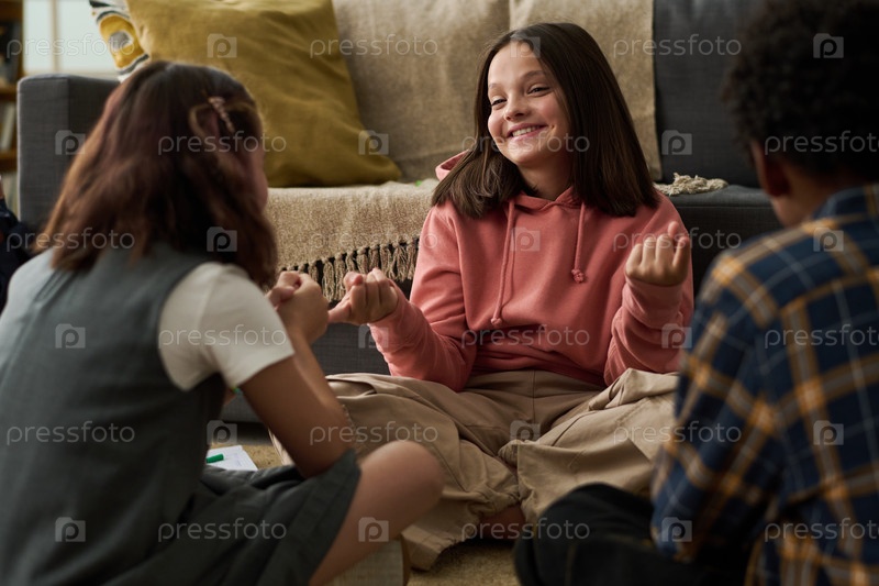 Улыбающаяся девушка сидит с друзьями на удобном диване