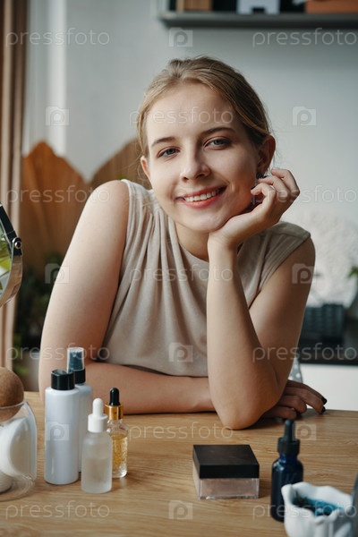 Улыбающаяся молодая женщина позирует в домашней обстановке