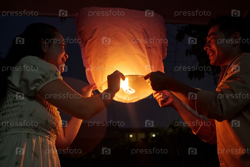Счастливая пара запускает фонари на открытом воздухе