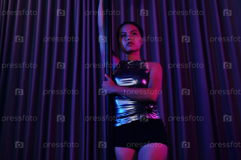 Впечатляющая поза с поднятой рукой в неоновом освещении