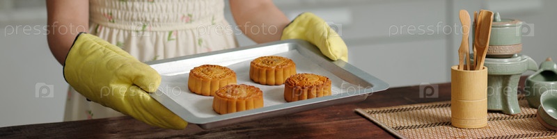 Женщина выпекает лунные торты дома