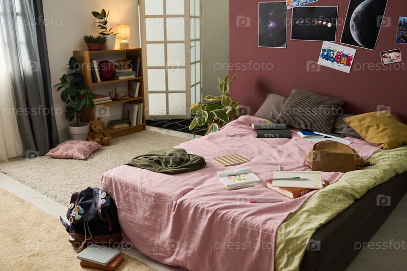 Уютная сцена спальни с открытыми книгами и комнатными растениями