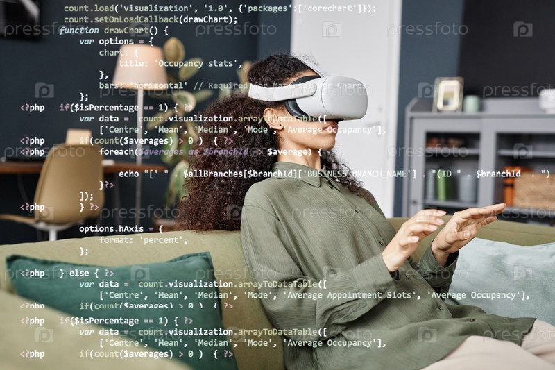 Девушка, которая носит гарнитуру VR и печатает в воздухе
