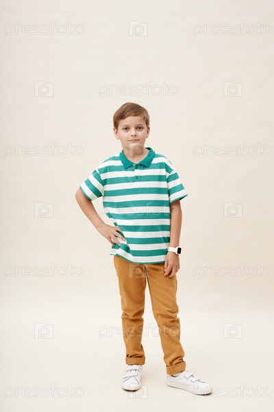 Претиенный мальчик, носящий футболку с брюками и умными часами, позирует рукой на талии в студии
