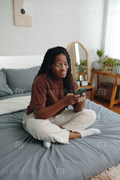 Улыбающаяся женщина использует смартфон в уютной спальне