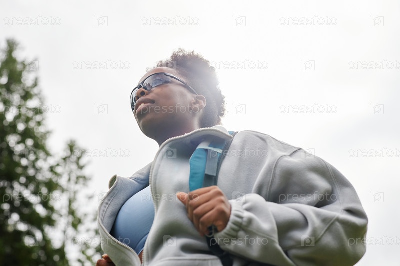 Черная женщина с рюкзаком на открытом воздухе