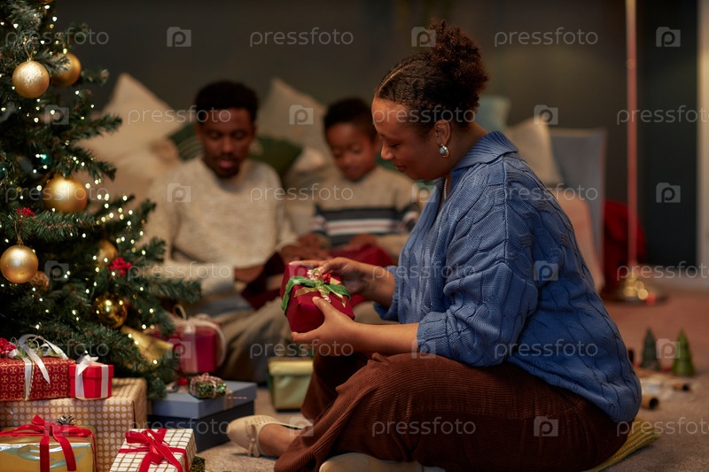 Улыбающаяся чернокожая женщина смотрит на подарки под елкой