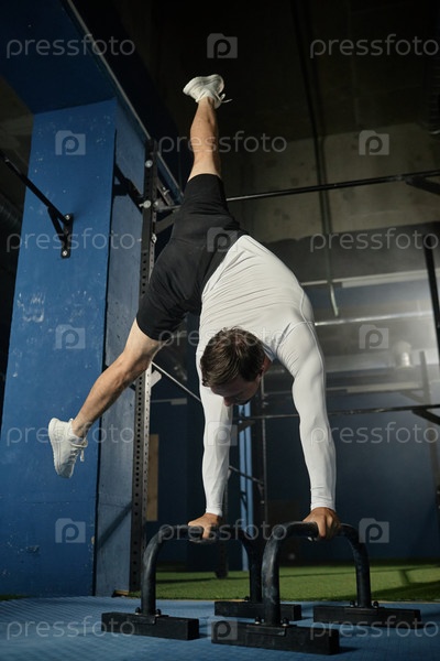Спортсмен в ручном положении на параллелях с одной ногой со стороны в тренажерном зале