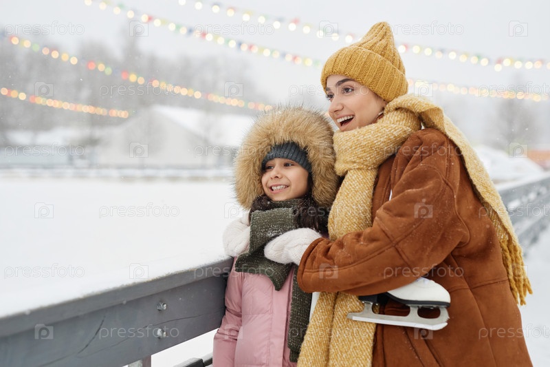 Мать и дочь смотрят на конькобежный каток в зимнем парке