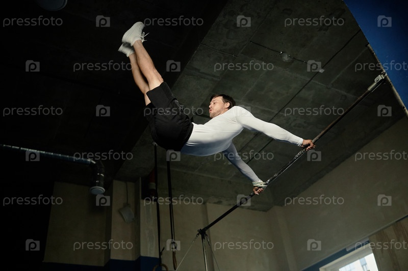 Мужской спортсмен, выполняющий гигантский качель на высокой стойке во время тренировки в тренажерном зале