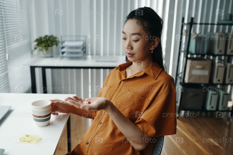 Молодая беременная женщина наслаждается расслабляющим моментом в офисной обстановке