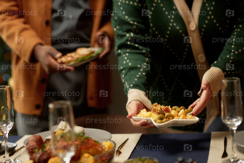 Женщина, подающая поднос с сыром на обеденном столе и женщина, помогающая в Рождество