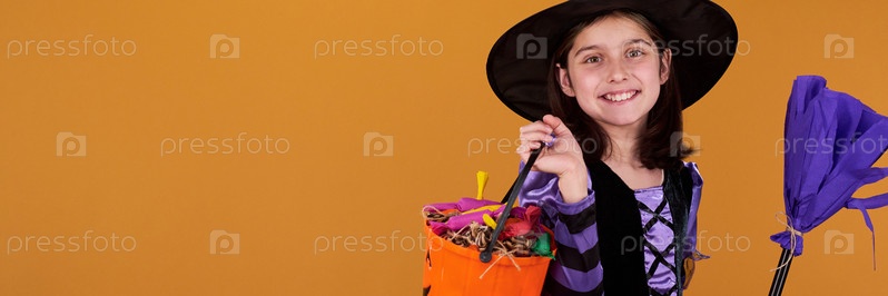 Счастливая ведьма с метлой и угощениями