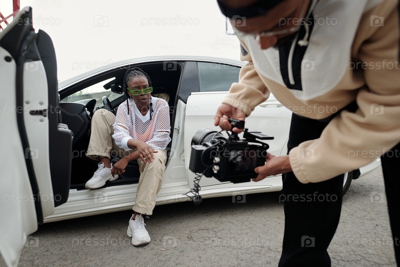 Афроамериканская женщина позирует у белой машины, пока ее фотографируют